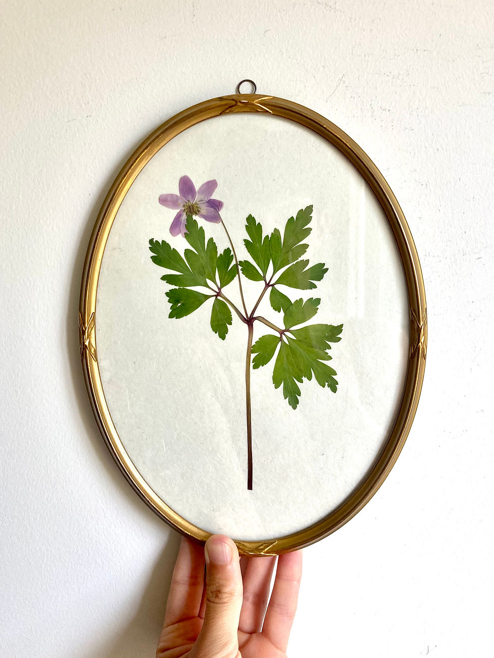 Ce tableau est une création unique et artisanale. Il est composé de fleurs soigneusement sélectionnées et séchées sous presse pendant plusieurs semaines. Cet herbier est mis en valeur par le charme ancien d’un cadre chiné.