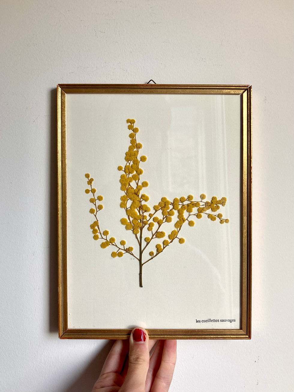 Ce tableau est une création unique et artisanale. Il est composé de fleurs soigneusement sélectionnées et séchées sous presse pendant plusieurs semaines. Cet herbier est mis en valeur par le charme ancien d’un cadre chiné.