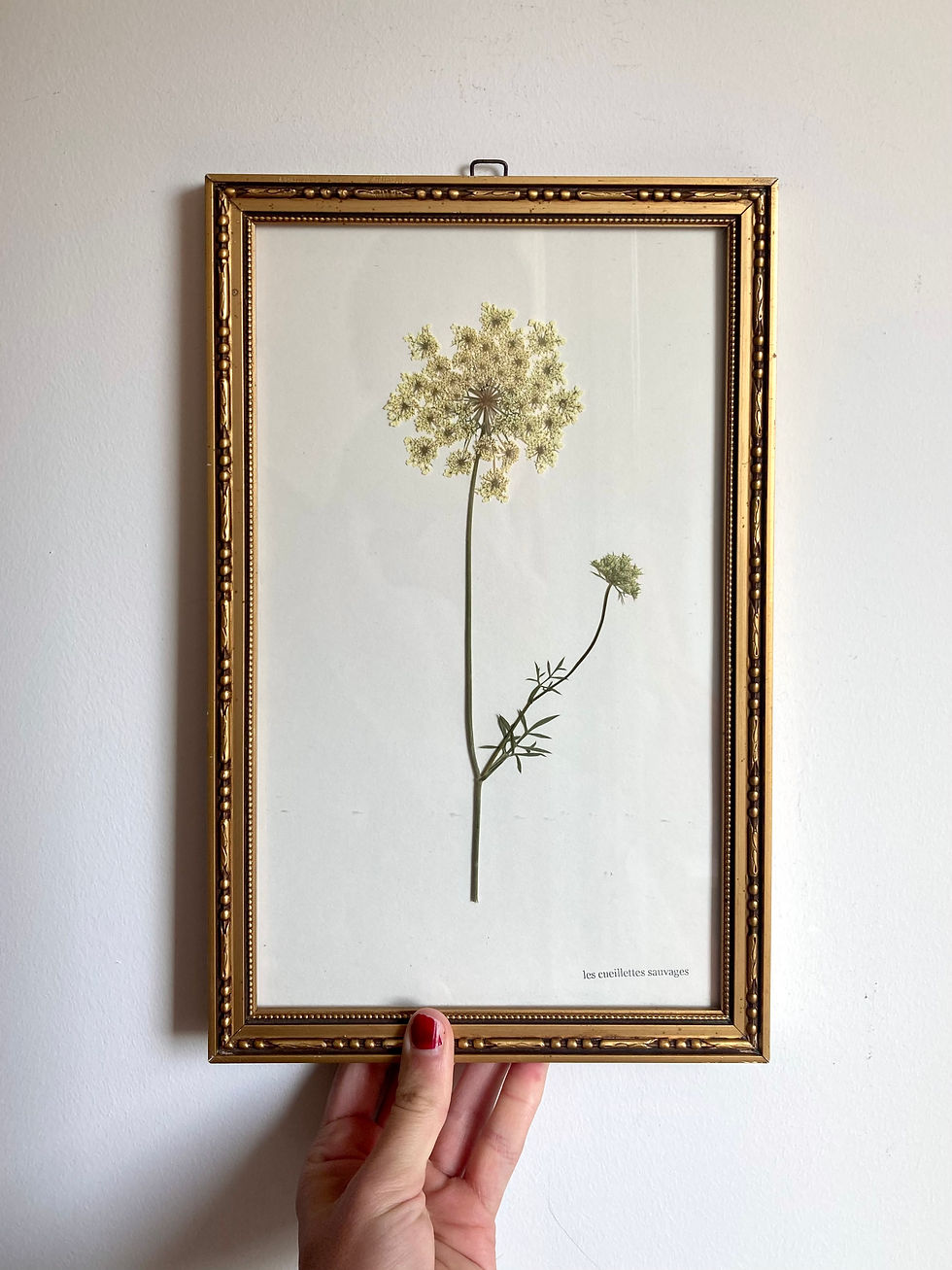 Ce tableau est une création unique et artisanale. Il est composé de fleurs soigneusement sélectionnées et séchées sous presse pendant plusieurs semaines. Cet herbier est mis en valeur par le charme ancien d’un cadre chiné.