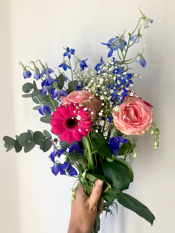 Delphinium, Rose, Eucalyptus, Renoncule d'Asie, Marguerite, Pivoine, Etoile du Sud, Lavande de mer