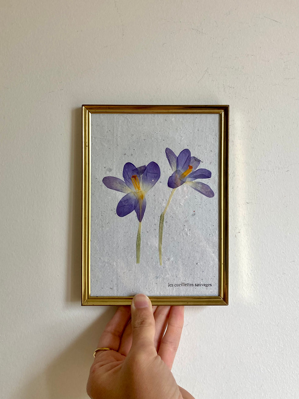 Ce tableau est une création unique et artisanale. Il est composé de fleurs soigneusement sélectionnées et séchées sous presse pendant plusieurs semaines. Cet herbier est mis en valeur par le charme ancien d’un cadre chiné.
