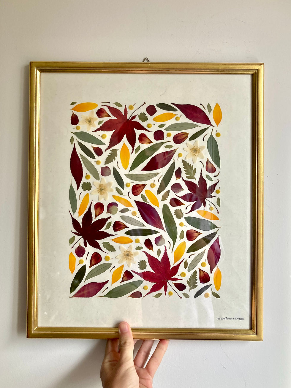 Ce tableau est une création unique et artisanale. Il est composé de fleurs soigneusement sélectionnées et séchées sous presse pendant plusieurs semaines. Cet herbier est mis en valeur par le charme ancien d’un cadre chiné.