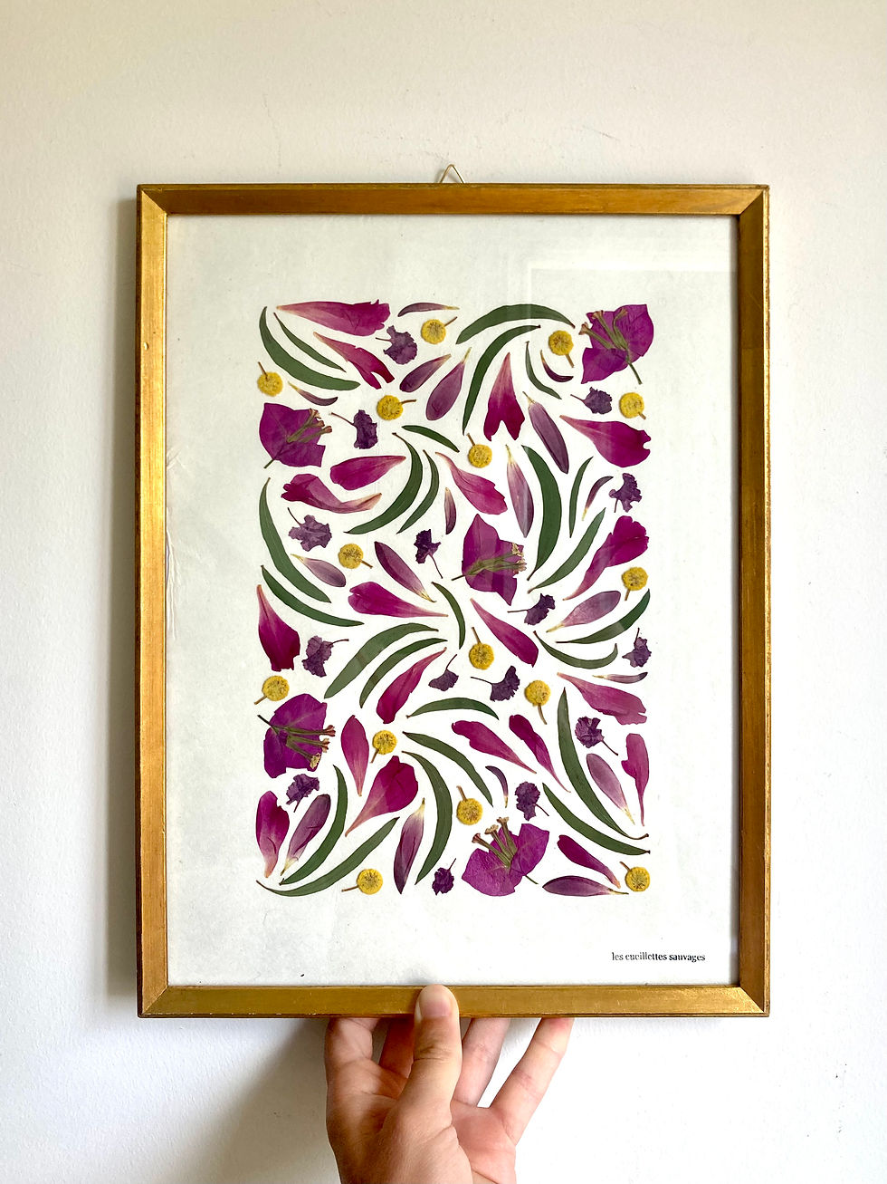 Ce tableau est une création unique et artisanale. Il est composé de fleurs soigneusement sélectionnées et séchées sous presse pendant plusieurs semaines. Cet herbier est mis en valeur par le charme ancien d’un cadre chiné.